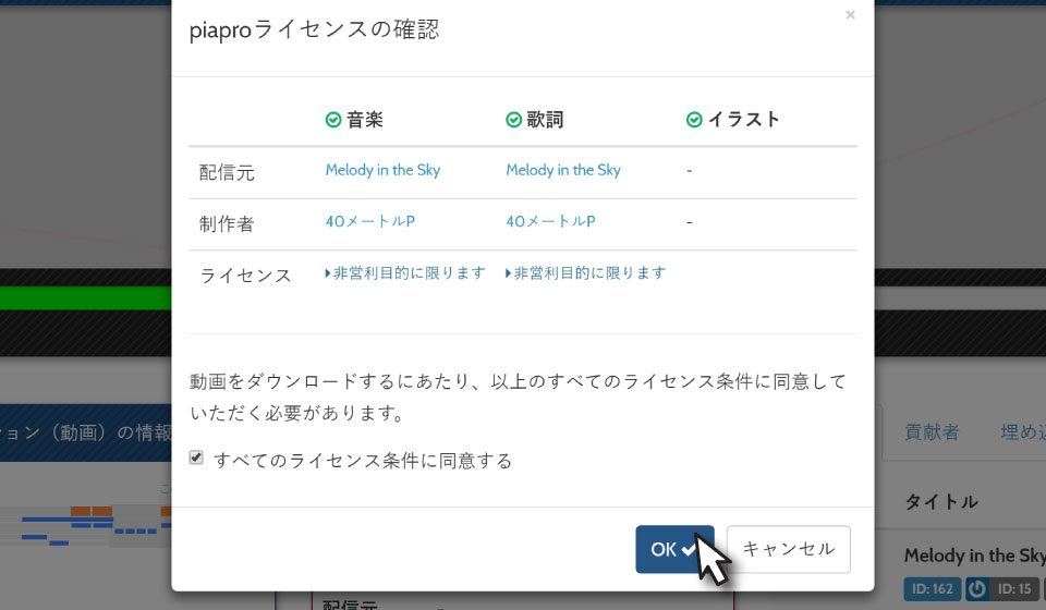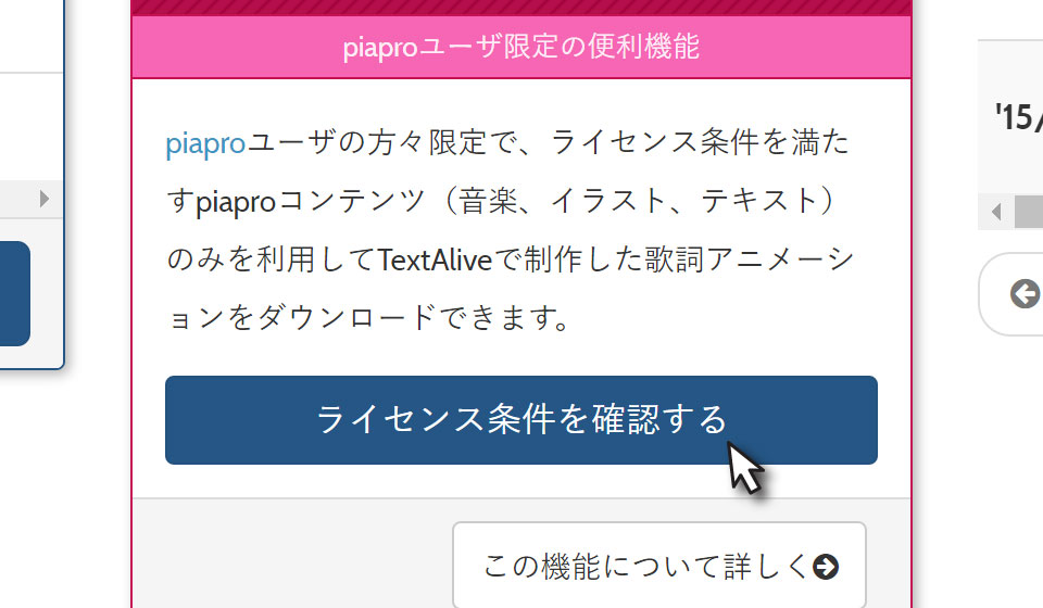 そこで、右に示すライセンス条件をすべて満たすpiaproコンテンツ(音楽、イラスト、テキスト)のみを利用して制作された歌詞アニメーションについては、動画ファイルとしてダウンロードできる新機能を公開しました。